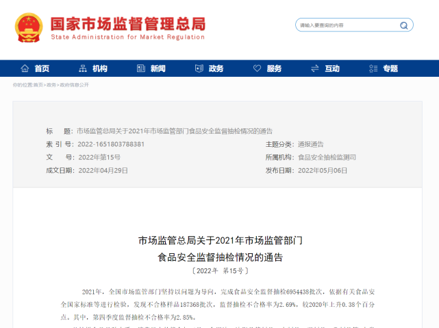 2022年5月6日,市場監(jiān)管總局發(fā)布了關(guān)于2021年市場監(jiān)管部門食品安全監(jiān)督抽檢情況的通告。2021年,全國市場監(jiān)管部門完成食品安全監(jiān)督抽檢6954438批次,依據(jù)有關(guān)食品安全國家標(biāo)準(zhǔn)等進(jìn)行檢驗(yàn),發(fā)現(xiàn)不合格樣品187368批次,監(jiān)督抽檢不合格率為2.69%,可喜的是,特醫(yī)食品全年共抽檢樣品1093批次,不合格率為零。