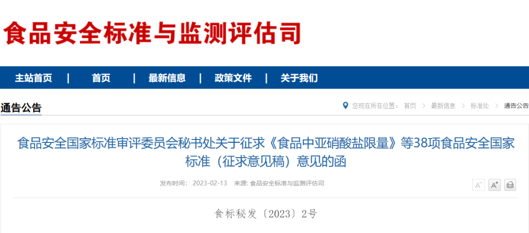 根據(jù)《食品安全法》及其實施條例規(guī)定,我委組織起草了《食品安全國家標(biāo)準(zhǔn)?食品中亞硝酸鹽限量》等38項食品安全國家標(biāo)準(zhǔn)和修改單(征求意見稿),現(xiàn)向社會公開征求意見。請于2023年3月20日前登錄食品安全國家標(biāo)準(zhǔn)管理信息系統(tǒng)(https://sppt.cfsa.net.cn:8086/cfsa_aiguo)在線提交反饋意見。