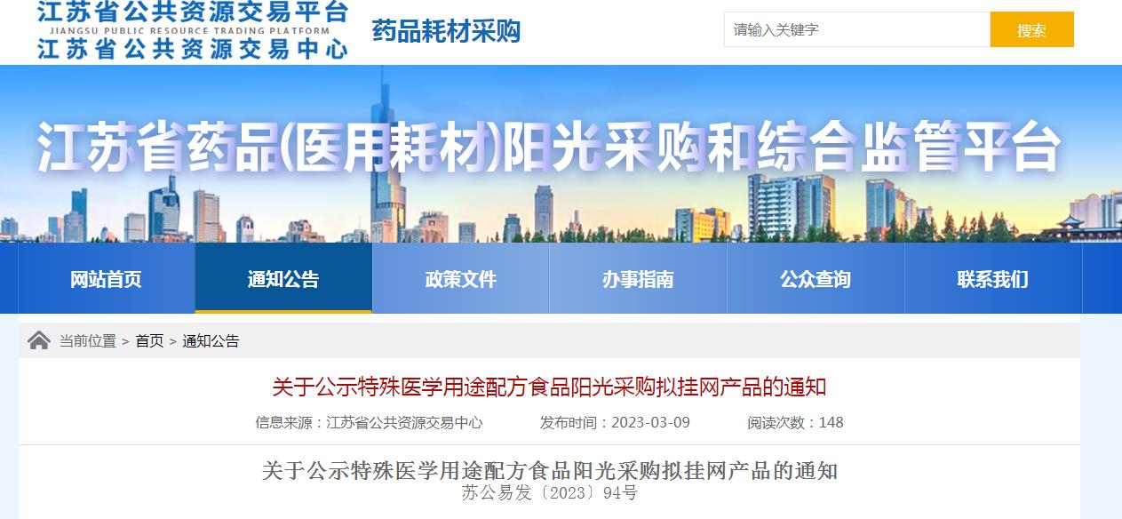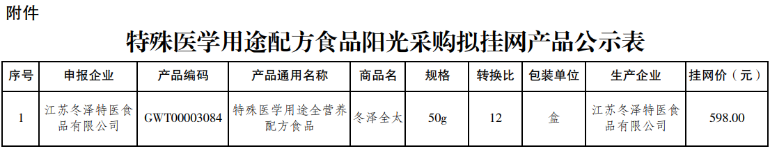2023年3月9日,江蘇省公共資源交易中心發(fā)布了關(guān)于公示特殊醫(yī)學(xué)用途配方食品陽光采購擬掛網(wǎng)產(chǎn)品的通知,此次共公布涉及1款產(chǎn)品冬澤全太。
