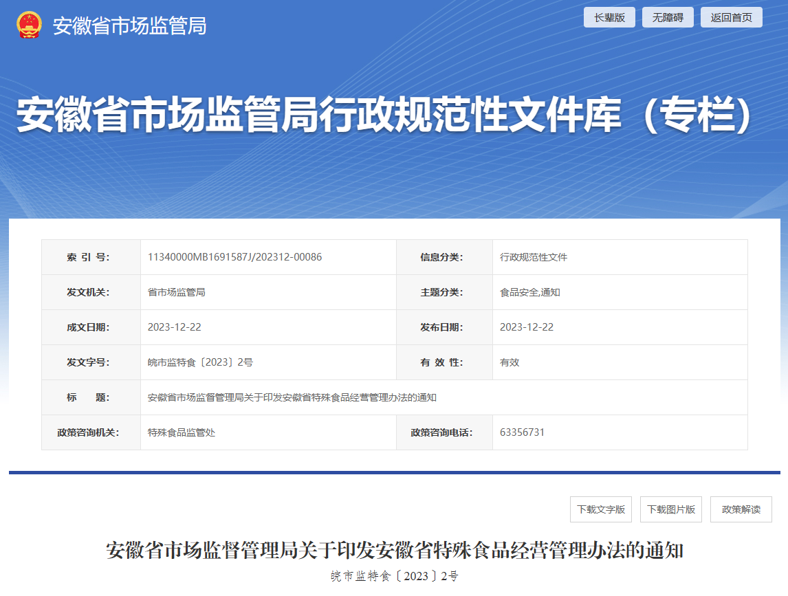 安徽省市場監(jiān)督管理局關于印發(fā)安徽省特殊食品經營管理辦法的通知