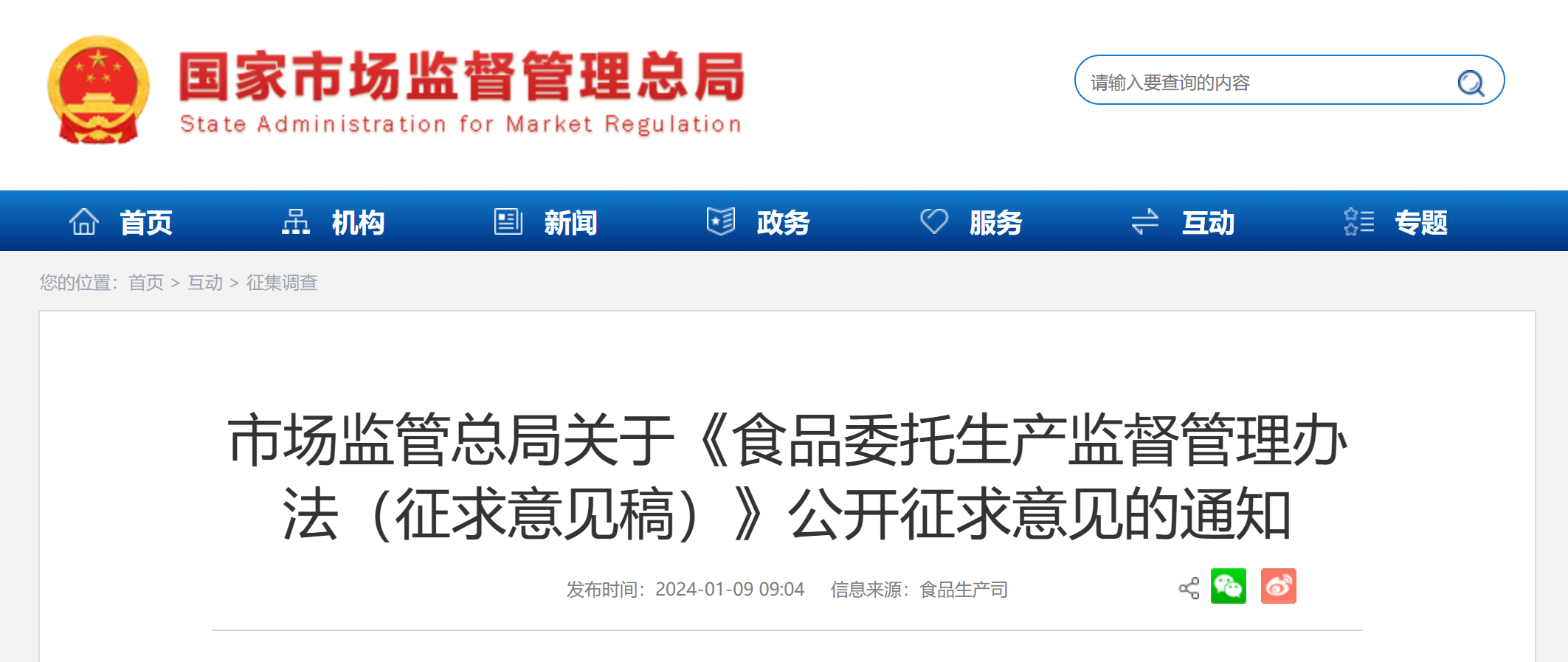 網(wǎng)站首頁(yè) >> 國(guó)家市場(chǎng)監(jiān)管總局關(guān)于《食品委托生產(chǎn)監(jiān)督管理辦法(征求意見(jiàn)稿)》公開征求意見(jiàn)的通知