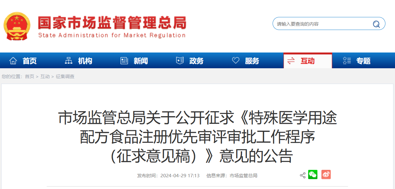 重磅|總局公開征求《特醫(yī)食品注冊優(yōu)先審評審批工作程序(征求意見稿)》意見的公告