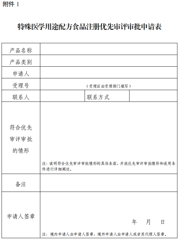 (一)申請注冊 申請人應當在提交特殊醫(yī)學用途配方食品注冊申請的同時,提 交《特殊醫(yī)學用途配方食品注冊優(yōu)先審評審批申請表》(附件 1), 并掃描電子版上傳至特殊醫(yī)學用途配方食品注冊申請系統(tǒng)。