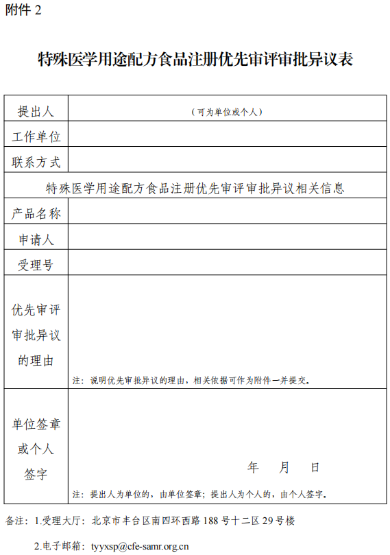 5.對公示項目有異議的,應當在公示期內向食品審評中心提交 書面意見并說明理由(以受理大廳現(xiàn)場提交日期或電子郵件接收日 期為準),同時提交《特殊醫(yī)學用途配方食品注冊優(yōu)先審評審批項 目異議表》(附件 2)。異議辦理時間為 10 個工作日,食品審評 中心將辦理結果告知申請人和提出異議方。