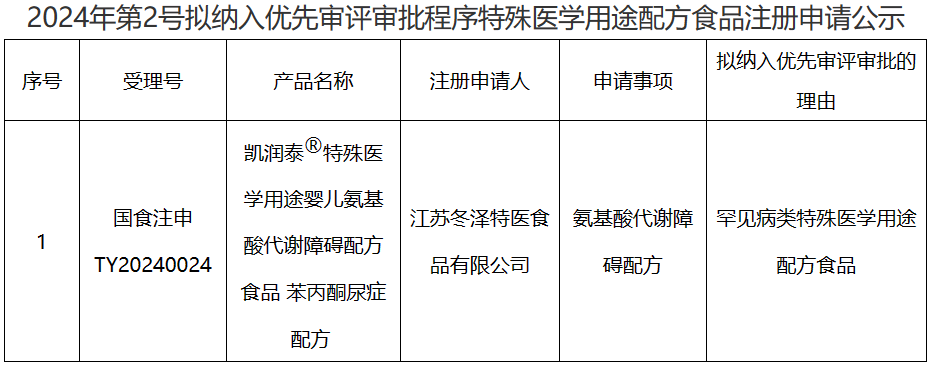 近日,國家市場監(jiān)督管理總局食品審評中心發(fā)布了“擬納入優(yōu)先審評審批程序特殊醫(yī)學(xué)用途配方食品注冊申請的公示(2024年第2號)”,涉及1家企業(yè)1款產(chǎn)品。