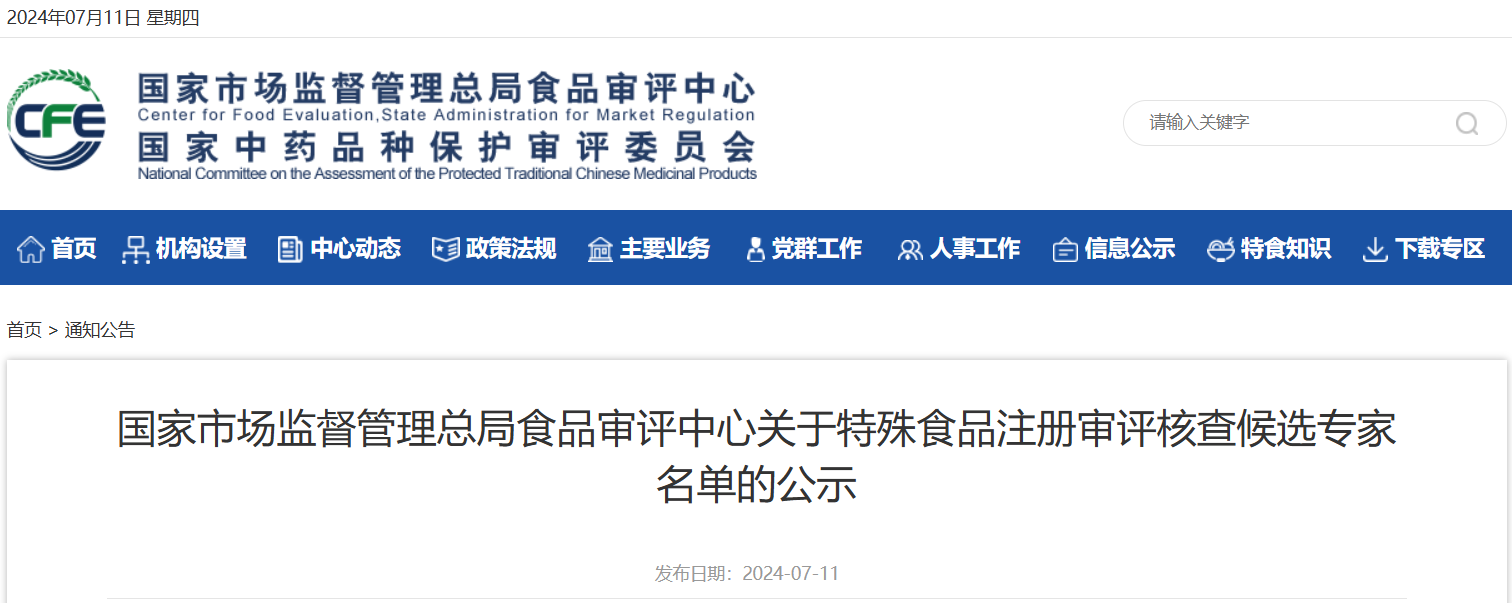 7月11日,國家市場監(jiān)督管理總局食品審評中心關(guān)于特殊食品注冊審評核查候選專家名單的公示。