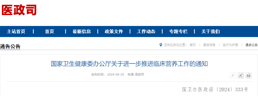 為進一步強化臨床營養(yǎng)工作落實,推動醫(yī)療服務(wù)高質(zhì)量發(fā)展,改善群眾就醫(yī)感受,近日,國家衛(wèi)生健康委辦公廳制定印發(fā)了《關(guān)于進一步推進臨床營養(yǎng)工作的通知》(以下簡稱《通知》)。