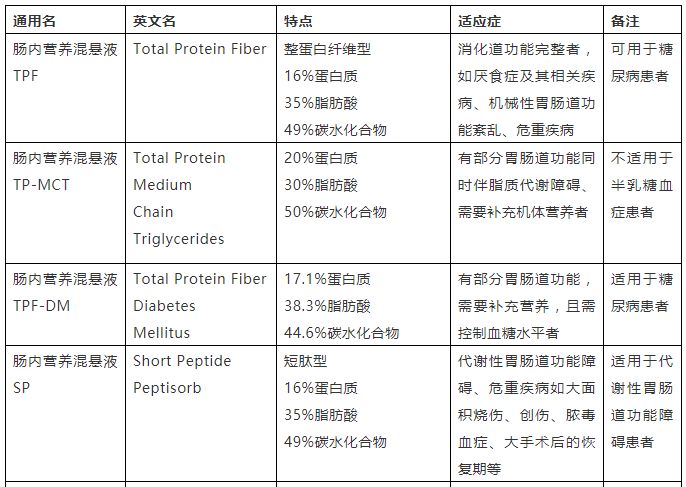 使用時(shí)需要充分評(píng)估患者的胃腸功能,根據(jù)評(píng)估結(jié)果選擇不同的腸內(nèi)營(yíng)養(yǎng)制劑。對(duì)胃腸道功能正常者,可選用整蛋白制劑;胃腸道功能低下者,如胰腺炎、炎性腸道疾病等,應(yīng)選擇氨基酸型或短肽型制劑。