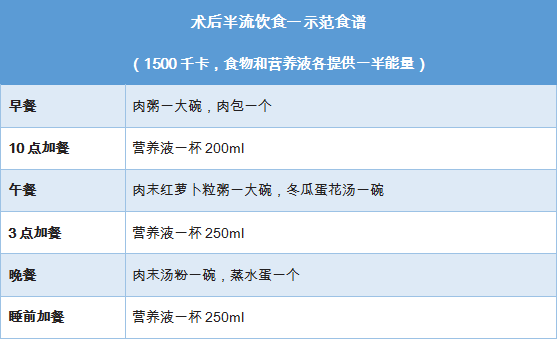 每個階段嘗試進食后,少量多餐,每日可以安排5-8餐次,至少3天都沒有出現(xiàn)惡心、嘔吐、腹脹、腹痛、腹瀉等情況后,就可以到下一階段飲食,最后恢復(fù)到正常飲食。下面示范一份術(shù)后半流食的食譜: