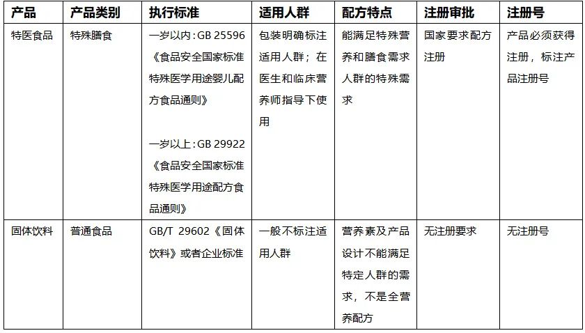 特殊醫(yī)學(xué)用途配方食品: 為目標人群提供營養(yǎng)支持,降低營養(yǎng)不良風(fēng)險,保障其健康。經(jīng)注冊批準的特殊醫(yī)學(xué)用途配方食品在標簽上有明顯標識,要在醫(yī)生和臨床營養(yǎng)師指導(dǎo)下使用。藥品:當(dāng)出現(xiàn)或發(fā)生疾病狀態(tài)時,可通過選擇并食用藥品預(yù)防、診斷及治療疾病,藥品按照藥品監(jiān)督管理法監(jiān)管。