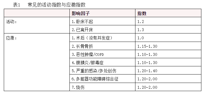 b. 用Harris-Benedict(H-B)公式估算靜息狀態(tài)下的基礎(chǔ)能量消耗(basal energy expenditure,BEE),TEE = BEE×活動(dòng)指數(shù)×應(yīng)激指數(shù),見(jiàn)表1。