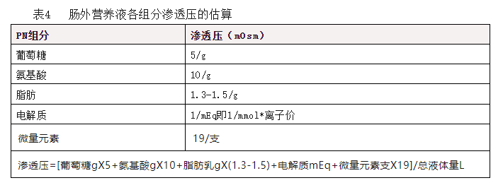 通過(guò)外周靜脈置管(peripheral venous catheter,PVC)給予腸外營(yíng)養(yǎng)是首選的輸注途徑,具有靜脈入路容易、護(hù)理方便、不存在中心靜脈置管風(fēng)險(xiǎn)和較為經(jīng)濟(jì)等優(yōu)點(diǎn)。但高滲營(yíng)養(yǎng)液易引起血栓性靜脈炎,PN 超過(guò) 14 天者,通常應(yīng)行中心靜脈置管(central venous catheter,CVC)。外周腸外營(yíng)養(yǎng)適用于接受較低滲透濃度(通常建議≤ 900mOsm/L)營(yíng)養(yǎng)液的短期治療。PN 中各組分的總滲透壓除以總液體量即為滲透濃度。