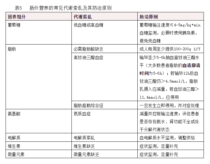 腸外營(yíng)養(yǎng)中各組分供給不足或過(guò)量,均會(huì)引起代謝性問(wèn)題,見(jiàn)表5。在臨床實(shí)踐中,準(zhǔn)確評(píng)估每位患者的營(yíng)養(yǎng)素需求是非常困難的,因此,必須積極營(yíng)養(yǎng)監(jiān)測(cè),根據(jù)患者的代謝需求調(diào)整營(yíng)養(yǎng)方案。