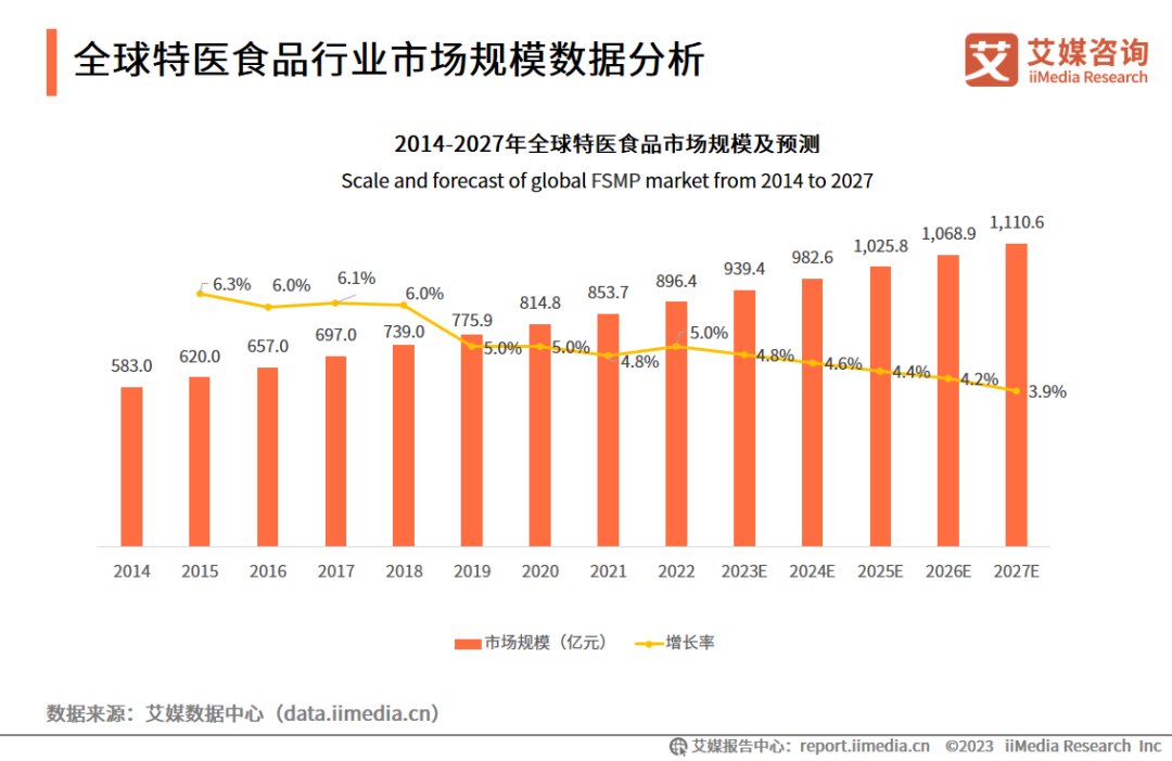 iiMedia Research(艾媒咨詢)數(shù)據(jù)顯示,2014-2022年全球特醫(yī)食品市場規(guī)模從583.0億元上升到896.4億元;預(yù)計(jì)2027年將突破千億大關(guān),達(dá)1110.6億元。艾媒咨詢分析師認(rèn)為,隨著全球人口老齡化趨勢加劇,平均預(yù)期壽命繼續(xù)增加,特醫(yī)食品行業(yè)成為大健康產(chǎn)業(yè)的新藍(lán)海,市場規(guī)模將會進(jìn)一步擴(kuò)大。
