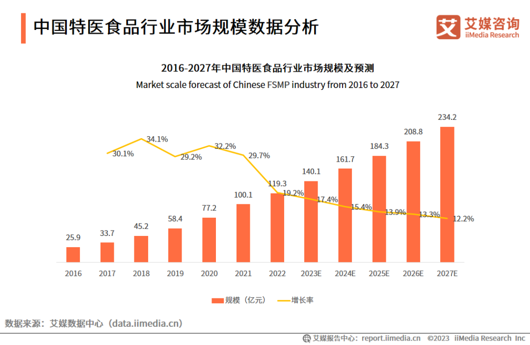 隨著人口老齡化的加劇,老年人口數(shù)量不斷增加,且慢性疾病患者也在增加,特醫(yī)食品行業(yè)迎來發(fā)展空間。iiMedia Research(艾媒咨詢)數(shù)據(jù)顯示,中國特醫(yī)食品行業(yè)市場規(guī)模從2016年的25.9億元增至2022年的119.3億元。艾媒咨詢分析師認(rèn)為,隨著人們健康意識的提高和生活水平的提高,特醫(yī)食品需求逐漸增加,其市場規(guī)模將持續(xù)保持增長,預(yù)計(jì)2027年中國特醫(yī)食品市場規(guī)模將達(dá)234.2億元??破詹蛔愫蜖I養(yǎng)教育是妨礙特醫(yī)食品發(fā)展的重要因素,加快特醫(yī)食品在臨床和公眾中的普及將會是行業(yè)各方亟需解決的問題。