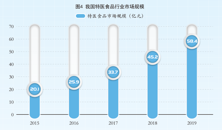 而我國也從2015年的20.1億迅速增長到2019年的58.4億元,擴(kuò)大了近三倍的規(guī)模。年均復(fù)合增速達(dá)到30%以上,發(fā)展勢頭迅勐。人口老齡化、慢病患病率上升將進(jìn)一步提升特醫(yī)食品在中國的需求量。對標(biāo)發(fā)展成熟的歐美市場,我國特醫(yī)食品未來的市場規(guī)模超百億元是必然趨勢。