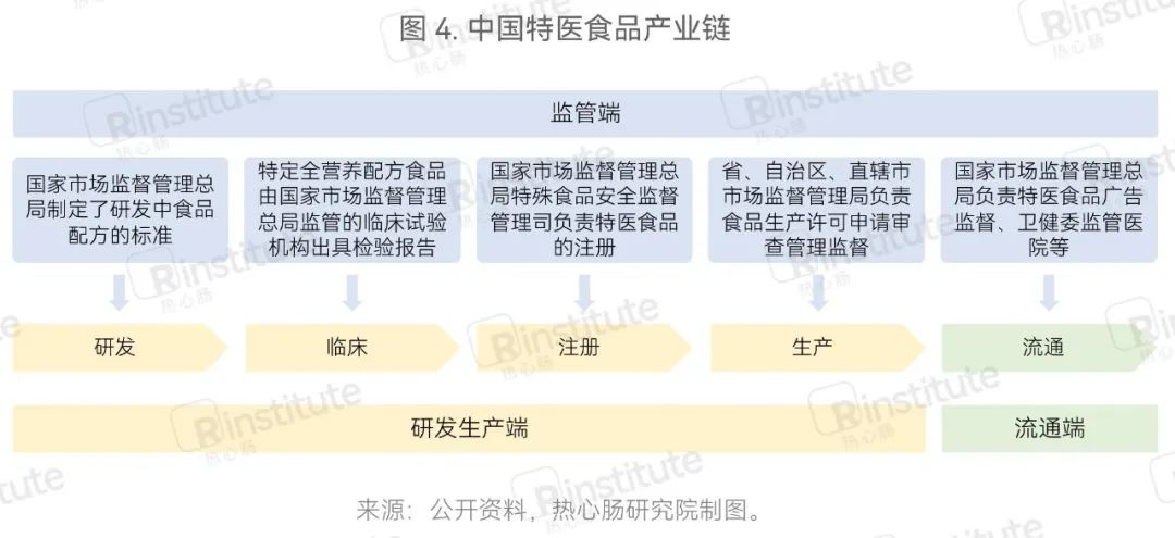 特醫(yī)食品的研發(fā)生產端和流通端組成了特醫(yī)食品的產業(yè)鏈。一款特醫(yī)食品的產生需經(jīng)過研發(fā)生產端的研發(fā)、臨床試驗、注冊審批、批量生產這幾個步驟后,才會流通到市場中售賣,交到消費者的手中。這每一步都有相應的機構進行監(jiān)管(圖4)。