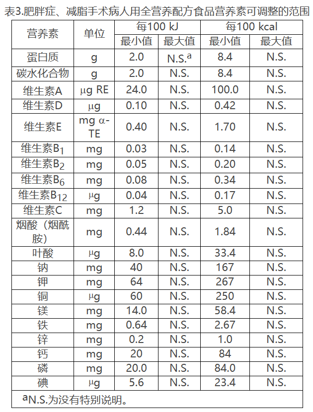 肥胖、減脂手術(shù)病人由于代謝紊亂而導(dǎo)致蛋白質(zhì)和微量營養(yǎng)素攝入不足現(xiàn)象,該類特定全營養(yǎng)配方食品的配方特點為在提供較低能量的同時可以保證充足的蛋白質(zhì)和微量營養(yǎng)素(維生素、礦物質(zhì)等)的供應(yīng),適用于肥胖、減脂手術(shù)病人。其產(chǎn)品配方應(yīng)滿足如下技術(shù)要求: