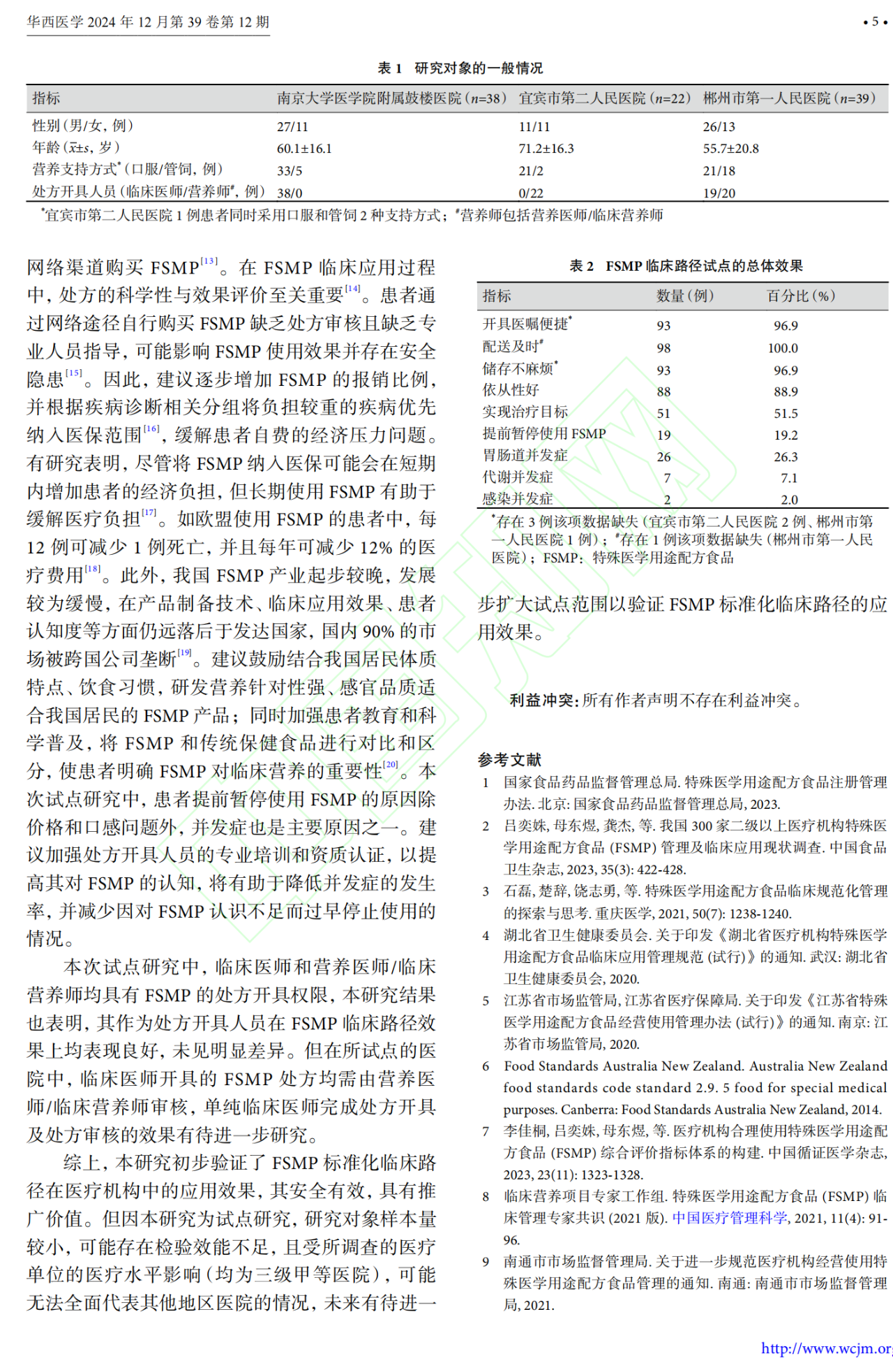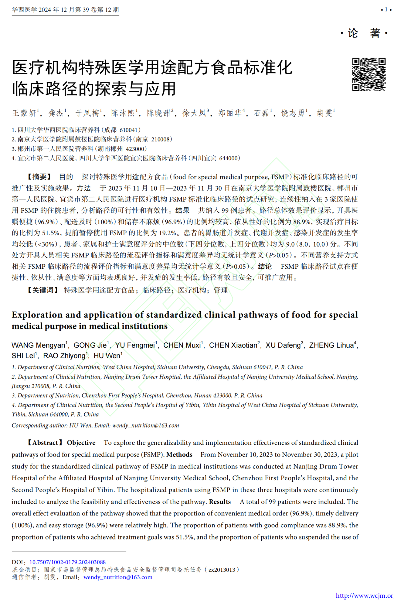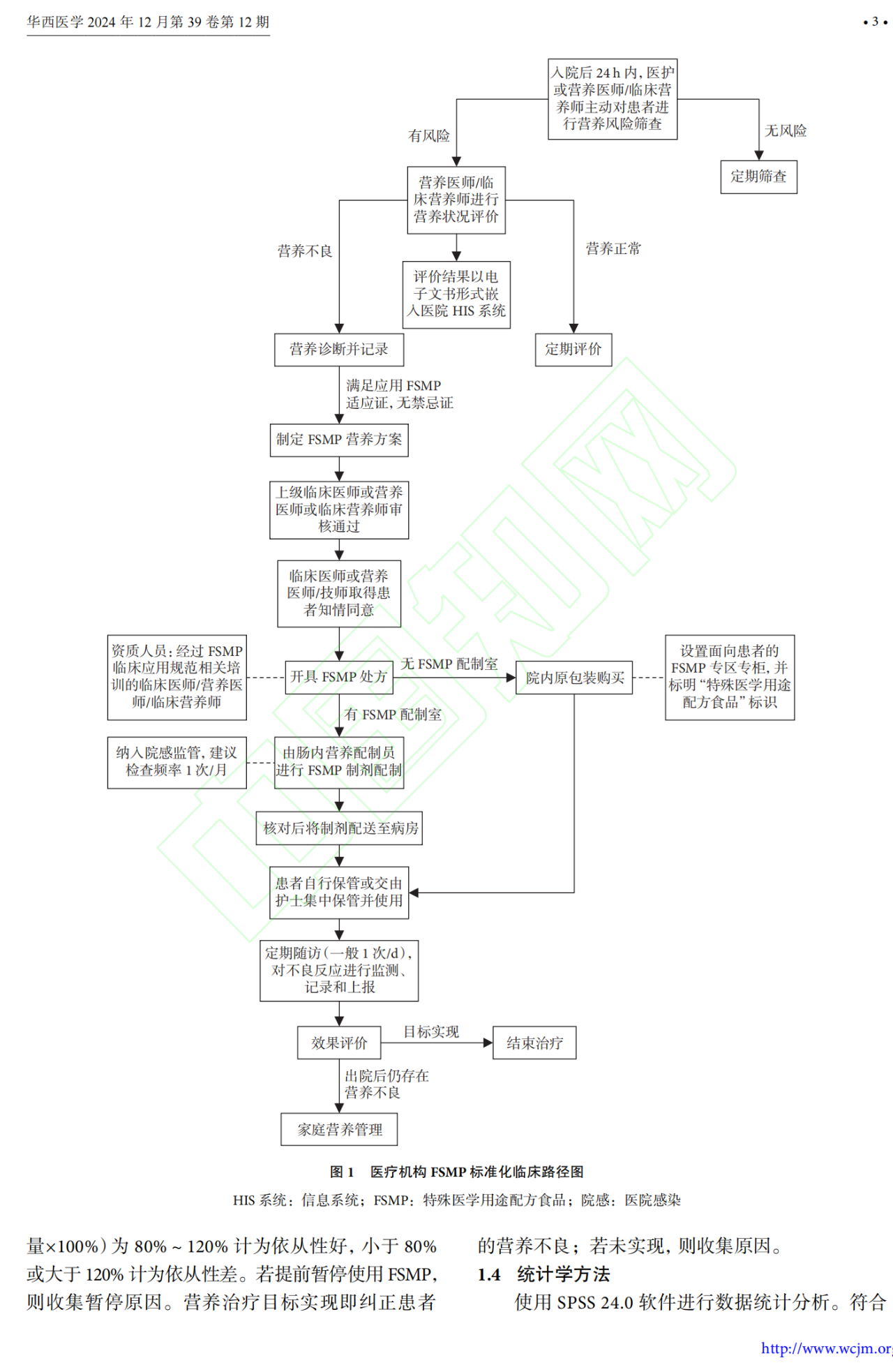 特殊醫(yī)學(xué)用途配方食品(FSMP)是為了滿足特定疾病狀態(tài)下人群對營養(yǎng)素或膳食的特殊需要而專門加工配制的配方食品。隨著FSMP在臨床上的廣泛應(yīng)用,如何規(guī)范管理及合理使用成為關(guān)鍵問題。本研究旨在探討FSMP標(biāo)準(zhǔn)化臨床路徑的可推廣性及實(shí)施效果,以期提高醫(yī)療機(jī)構(gòu)對FSMP的管理水平和臨床應(yīng)用效果。