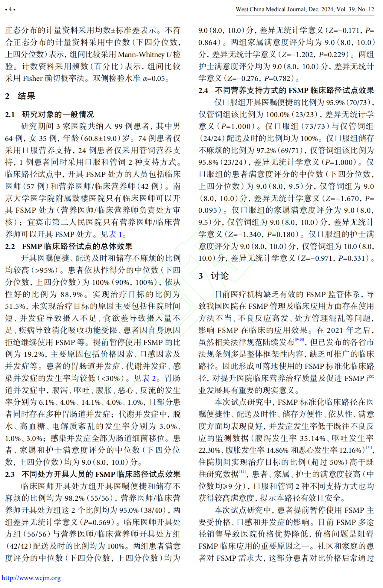 本研究為醫(yī)療機(jī)構(gòu)FSMP的規(guī)范化管理提供了實(shí)證支持,對于提升臨床營養(yǎng)治療質(zhì)量、促進(jìn)FSMP產(chǎn)業(yè)發(fā)展具有重要的現(xiàn)實(shí)意義。同時(shí),也為未來的研究提供了方向,包括擴(kuò)大試點(diǎn)范圍以驗(yàn)證FSMP標(biāo)準(zhǔn)化臨床路徑的應(yīng)用效果。